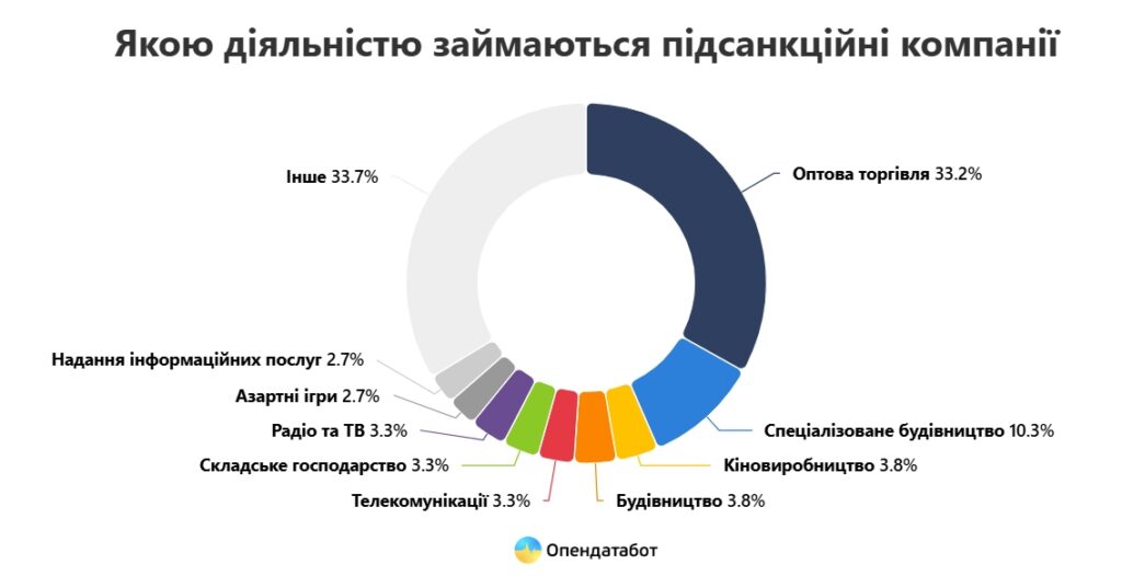 Среди отраслей доминирует оптовая торговля (61 компания или 33,2%). Специализированные строительные работы выполняют 10,3% подсанкционных предприятий, в то время как производство кино и строительство сооружений поделили третье место с одинаковыми показателями – по 7 компаний (3,8%).