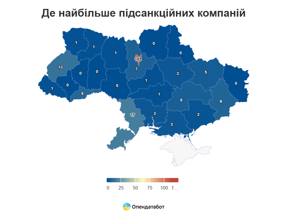 Больше подсанкционных компаний находятся в Киеве — 102 фирмы (55,4%). На втором месте Одесская область с 17 предприятиями (9,2%), третью позицию занимает Львовщина — 13 фирм (7,1%).