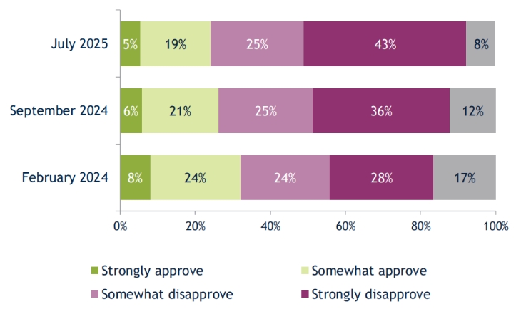 Еще хуже украинцы оценивают работу Верховной Рады: доверяют только 19%, не доверяют – 76%. Новое правительство во главе с премьером Юлией Свириденко также получило неоднозначную оценку: 28% респондентов доверяют, 30% – не доверяют, а 42% затруднились дать ответ.