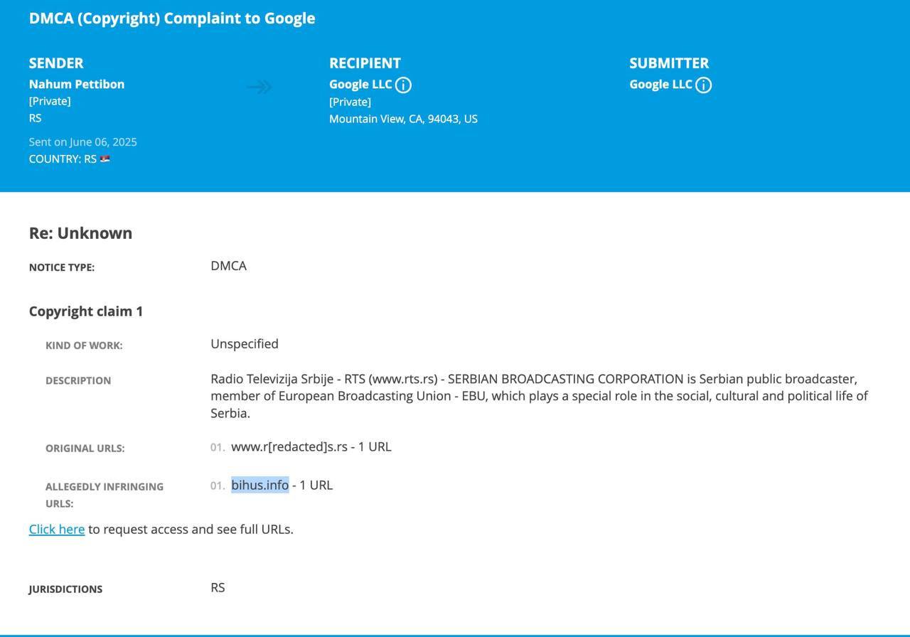 И Google, в частности, сообщает, что получает DMCA-жалобы на материалы украинских СМИ и проекта bihus.info. Поступают они от некого заявителя из Сербии (RS), который утверждает, что bihus.info якобы "украли" свое же расследование по его ноунейму сербского сайта - без ссылки на "первичный источник информации". На этом основании Google затем убирает из индексации все отрицательные новости, на которые жалуются такие аферисты.