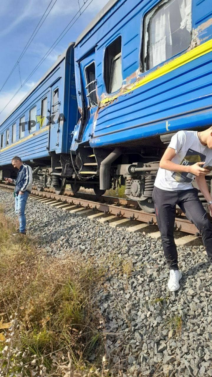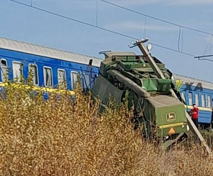 Между тем Телеграмм канал "Труха Харьков" пишет, что водитель комбайна не увидел помеху справа и влетел в поезд, зацепив его сзади.