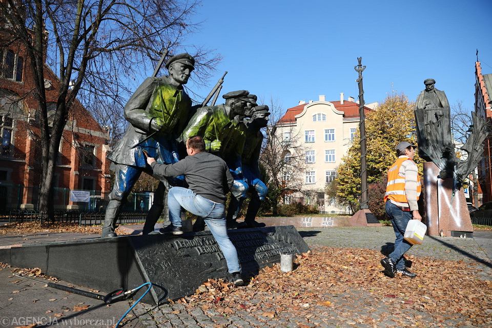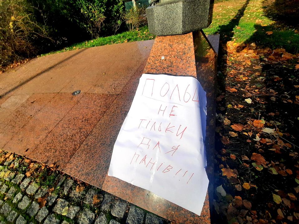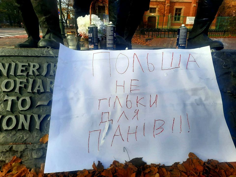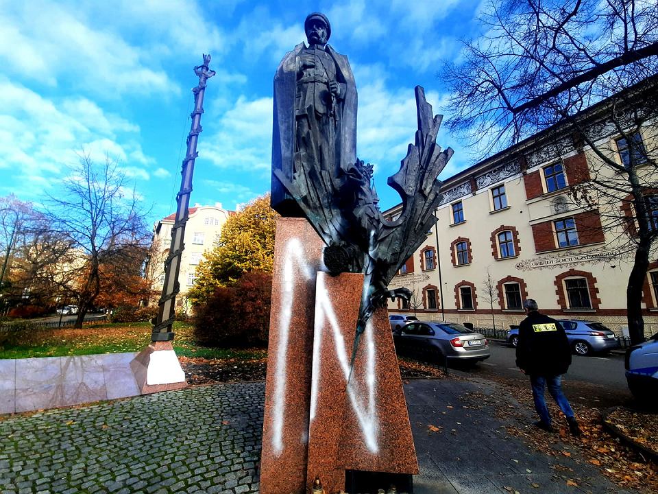 На месте происшествия оставили краску и баллончики с распылителем, а также записку с надписью на украинском языке: "Польша не только для господ". По словам очевидца, к акту вандализма причастны украинцы.