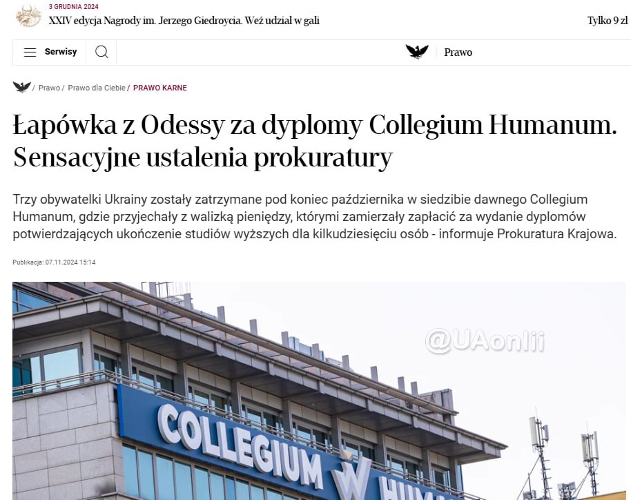 Collegium Humanum – это частный университет в Варшаве, погоревший на скандалах о фальшивых дипломах еще в 2023 году. Выяснилось, что за взятки университет выдал свидетельства об окончании обучения без проведения экзаменов и обязательных занятий. Масштаб деятельности следователи оценили как "шокирующий" – количество поддельных дипломов могло исчисляться тысячами, писало издание Wiadomosci.