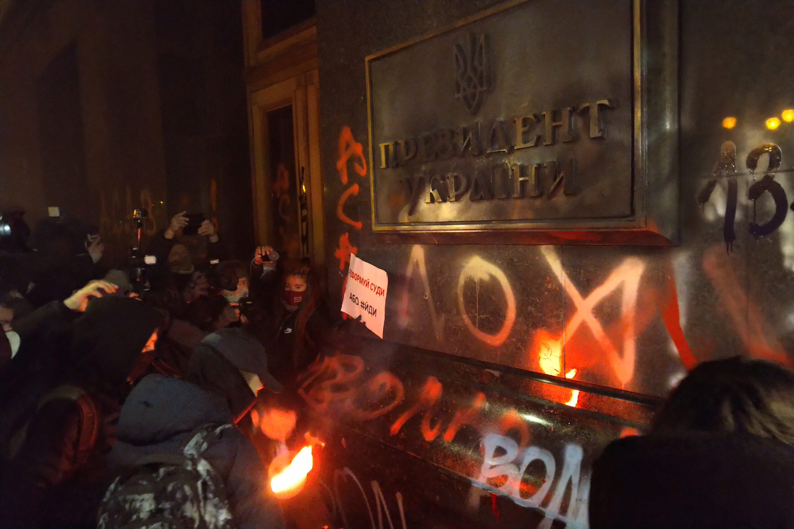 Контекст. 20 марта под стенами Офиса президента на улице Банковой в Киеве состоялась очередная акция протеста в поддержку осужденного активиста Сергея Стерненко. Протестующие разбили окна и двери здания ОП, забросили внутрь дымовую шашку и файеры.