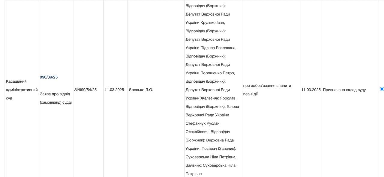 Верховный суд Украины рассматривает иск против нескольких депутатов ВР. Ответчиками выступают председатель Верховной Рады Украины Стефанчук Р.А., депутат Верховной Рады Украины Железняк Я.И., депутат Верховной Рады Украины Порошенко П.А., депутат Верховной Рады Украины Пидласа Р.А и депутат Верховной Рады Украины Крулько И.И., свидетельствуют данные Реестра судебных решений.