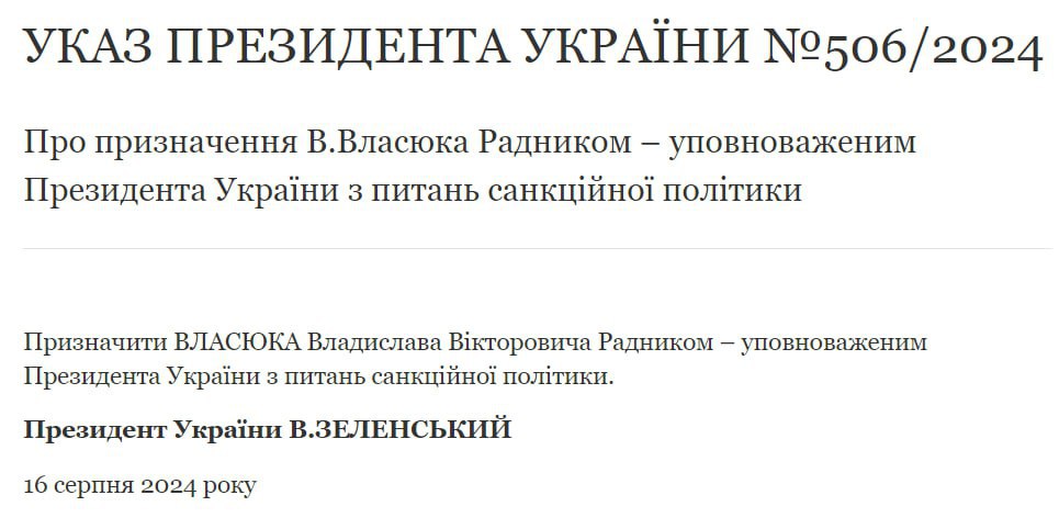 Сегодня, 16 августа, указом президента Владимира Зеленского был назначен Владислав Власюк уполномоченным по вопросам санкционной политики.
