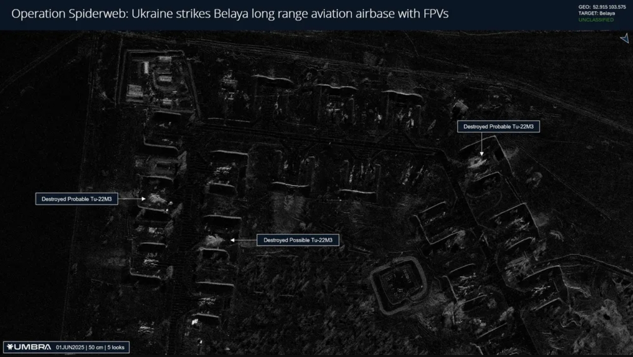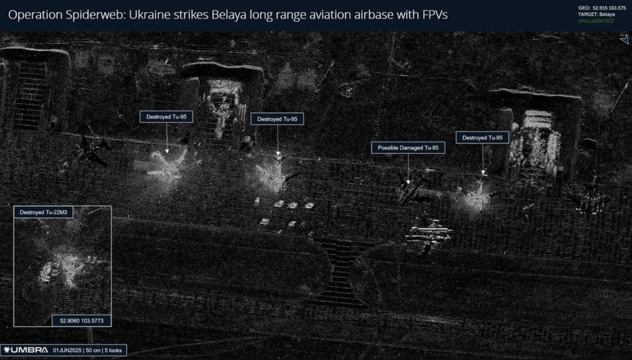 На снимках, сделанных со спутника, видна авиабаза "Белая" в Иркутской области, расположенная в более чем 4300 км от украинской границы. Аналитик обозначил на снимках несколько стратегических самолетов Ту-95 как "уничтожены" и "вероятно уничтожены". Также указаны обломки других машин, которые могут являться бомбардировщиками Ту-22М3.