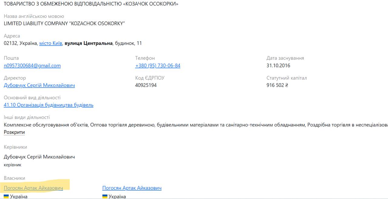 Заказчиком строительства значится компания ООО «Казачок Осокорки», арендующая участок у столичных властей. Ее единственным бенефициаром является Артак Погосян – друг детства народного депутата Андрея Стрихарского.
