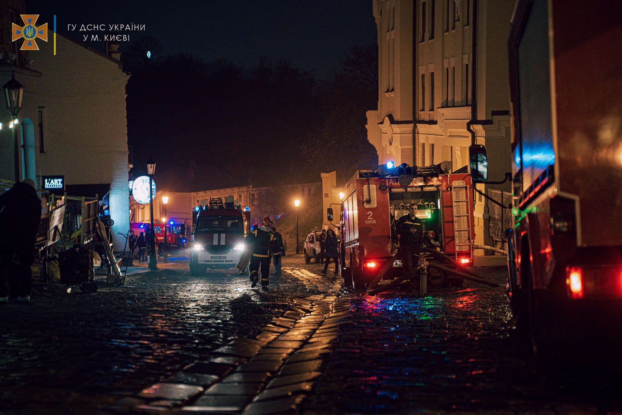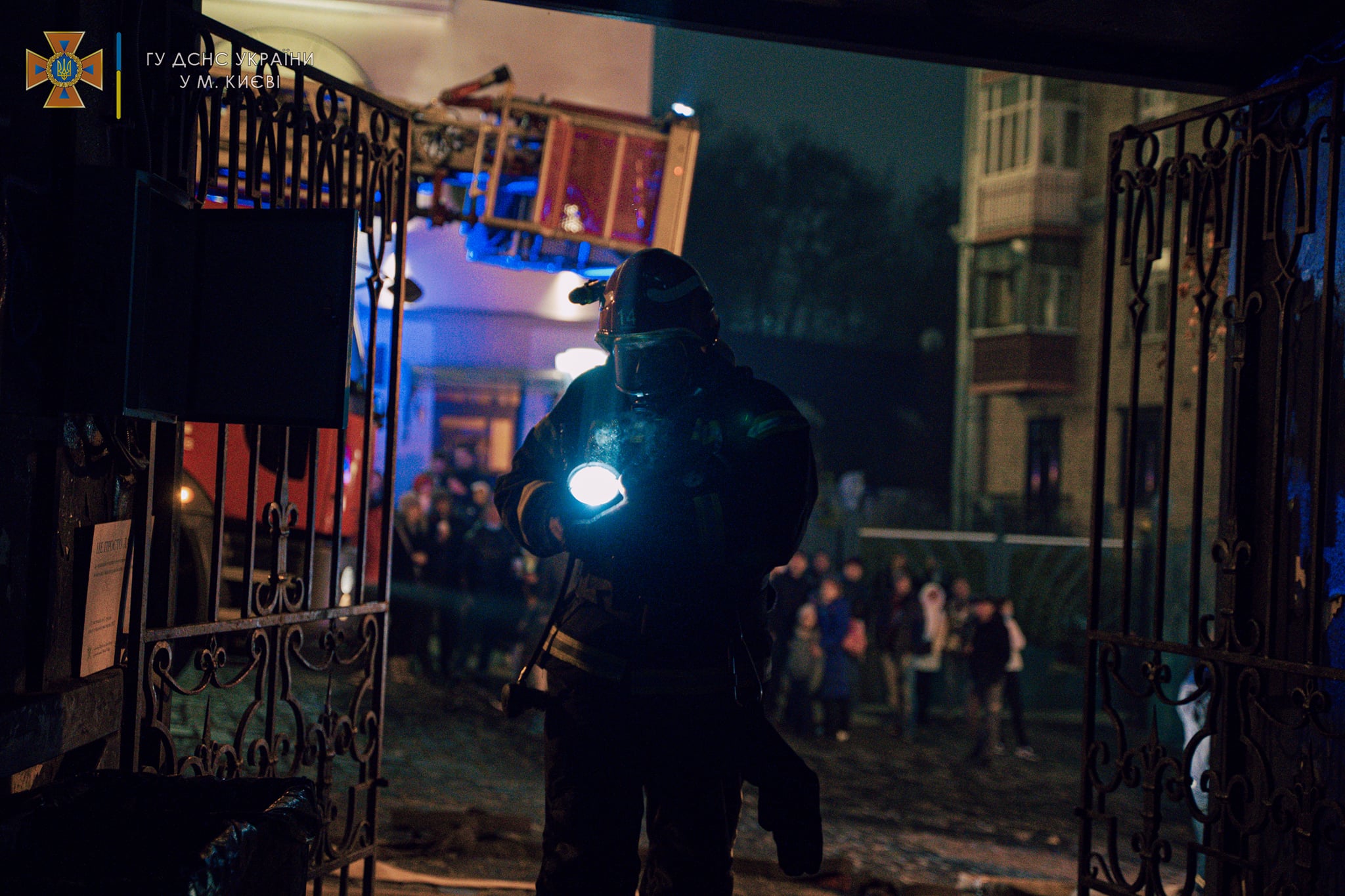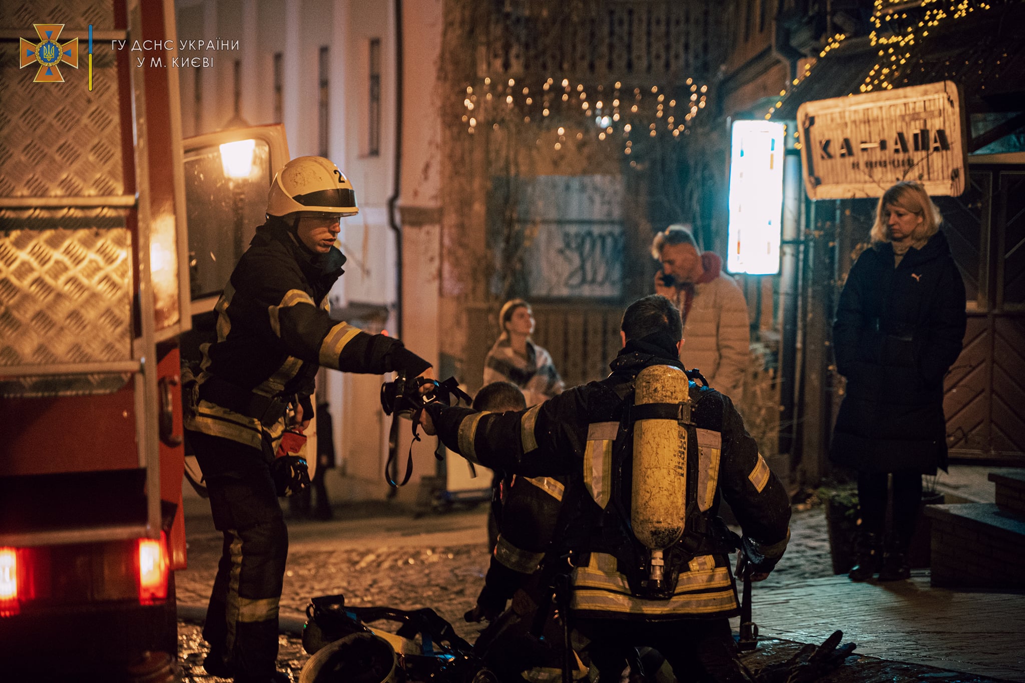 Двухэтажное здание ресторана загорелось вечером 14 ноября в Подольском районе столицы Киева по улице Андреевский спуск, 21.