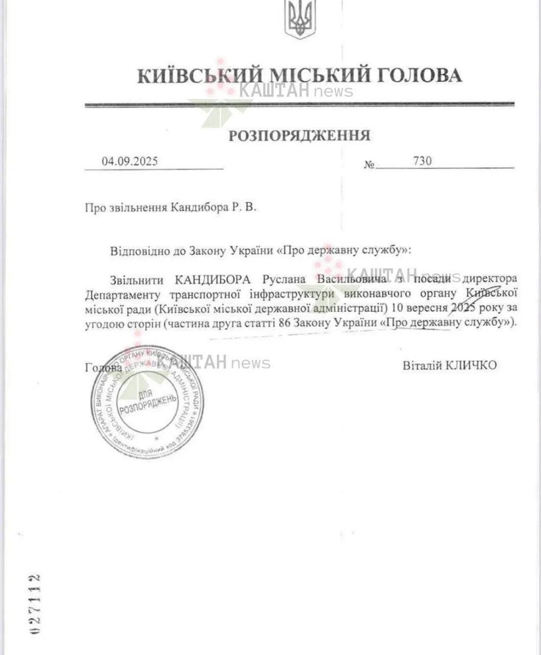 "Уволить Кандибора Руслана Васильевича с должности директора Департамента транспортной инфраструктуры исполнительного органа Киевского городского совета (Киевской городской государственной администрации) 10 сентября 2025 года по соглашению сторон", - говорится в распоряжении №730 от 4 сентября, копию которого обнародовало агентство "Интерфакс-Украина".