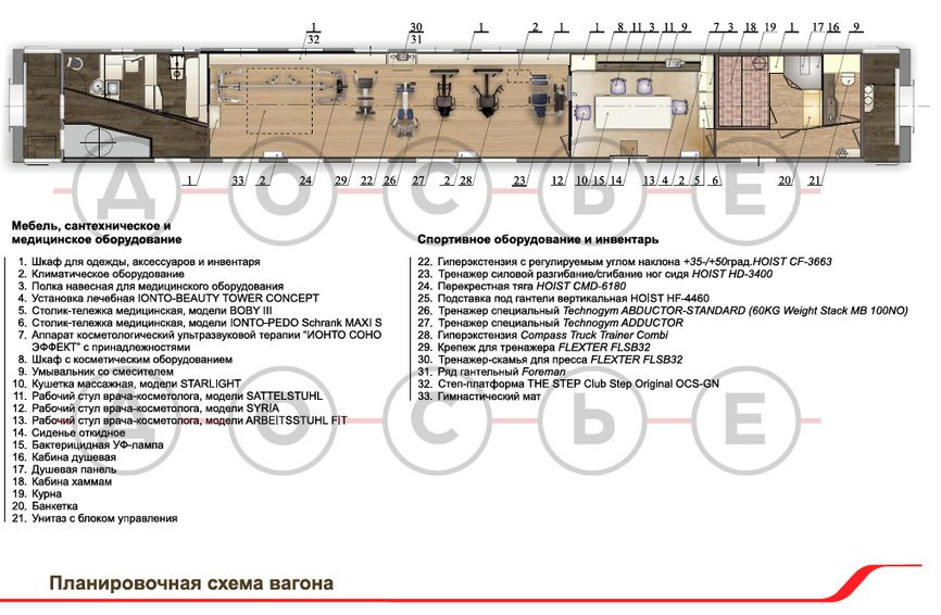 Внутри есть кабинет косметолога, тренажерный зал и даже хаммам, а при необходимости в этом вагоне можно спасти жизнь человеку, поскольку установлено необходимое современное медицинское оборудование.