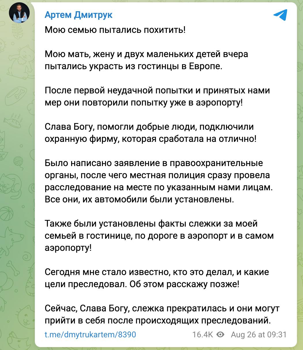 "Мою семью пытались похитить! Мою мать, жену и двух маленьких детей вчера пытались украсть из гостиницы в Европе. После первой неудачной попытки и принятых нами мер они повторили попытку уже в аэропорту! Слава Богу, помогли добрые люди, подключили охранную фирму, которая сработала на отлично!" - пишет Дмитрук.