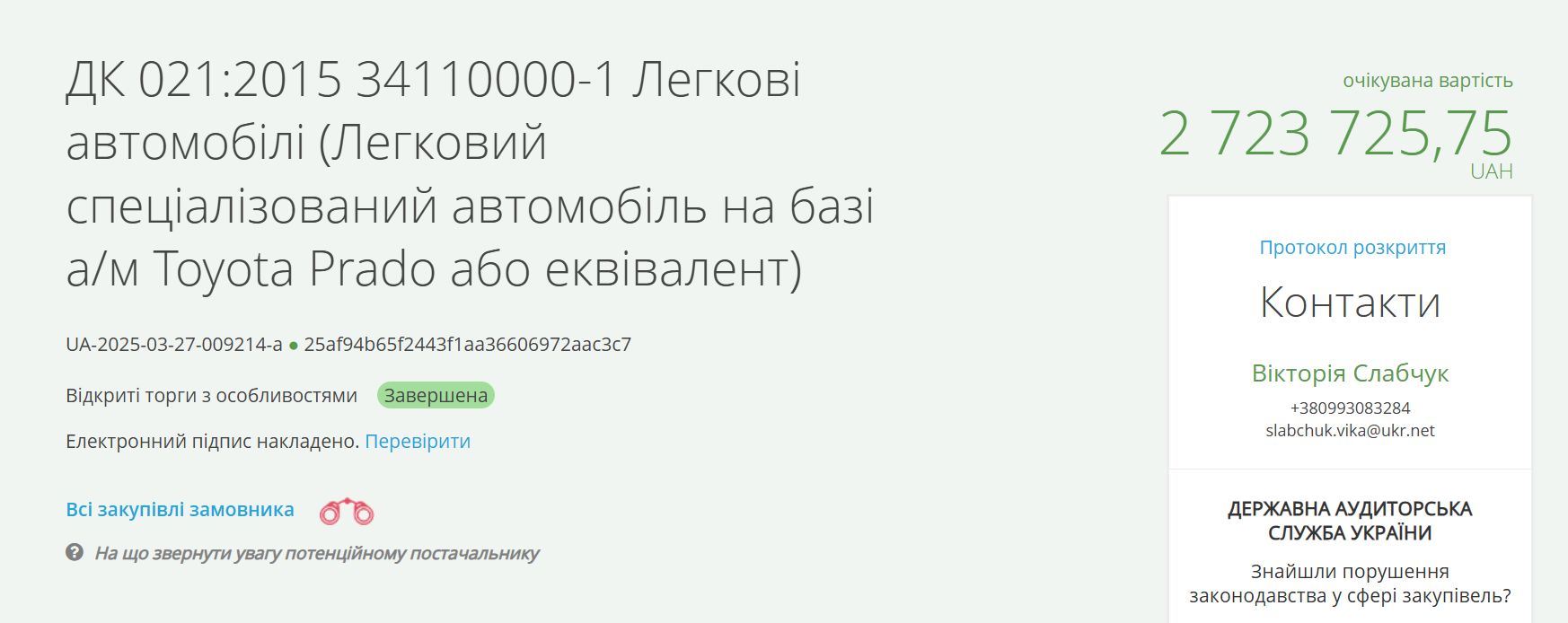 Управление Службы безопасности Украины в Одесской области заключило договор на приобретение автомобиля Toyota Prado на сумму 2,6 млн грн. Соответствующее соглашение было подписано с ООО "ВиДи Пальмира" в рамках спецфонда государственного бюджета.