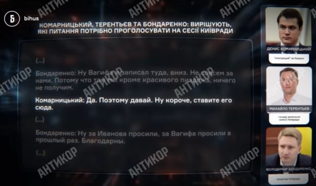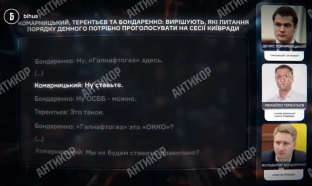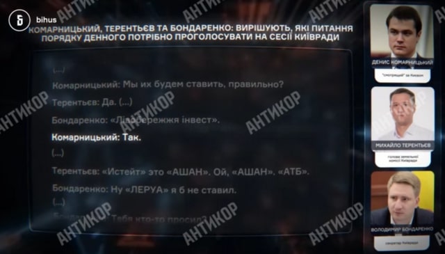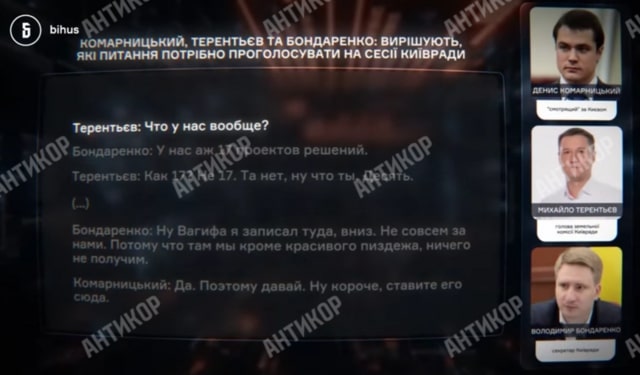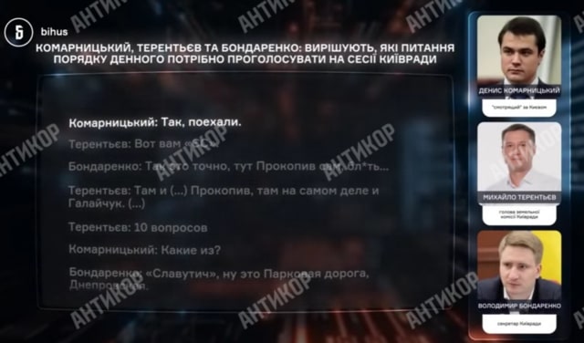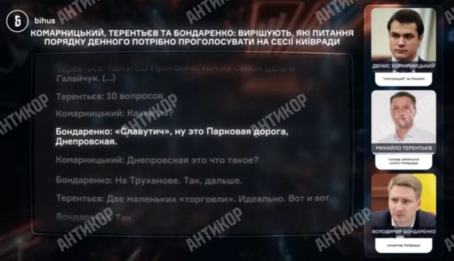 «У нас аж 17 проектов решений… Ну за Иванова просили… Благодарны… «Галнефтегаз» здесь… «Левобережье инвест»… Ну «Леруа» я бы не ставил», - обсуждает повестку сессии секретарь Киевсовета Владимир Бондаренко с Денисом Комарницким и директором КП «Инженерный центр» Михаил. Отпечаток этого телефонного разговора получили журналисты Bihus.info от НАБУ.