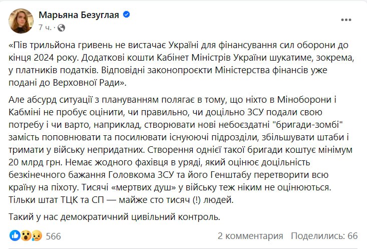 «Абсурдность ситуации с планированием состоит в том, что никто в Минобороны и Кабмине не пытается оценить, правильно ли, целесообразно ли ВСУ подали свою потребность, и стоит ли, например, создавать новые небоеспособные «бригады-зомби» вместо пополнения и усиливающегося существующих подразделений, увеличения штабы и держать в армии непригодных», – написала Безуглая.