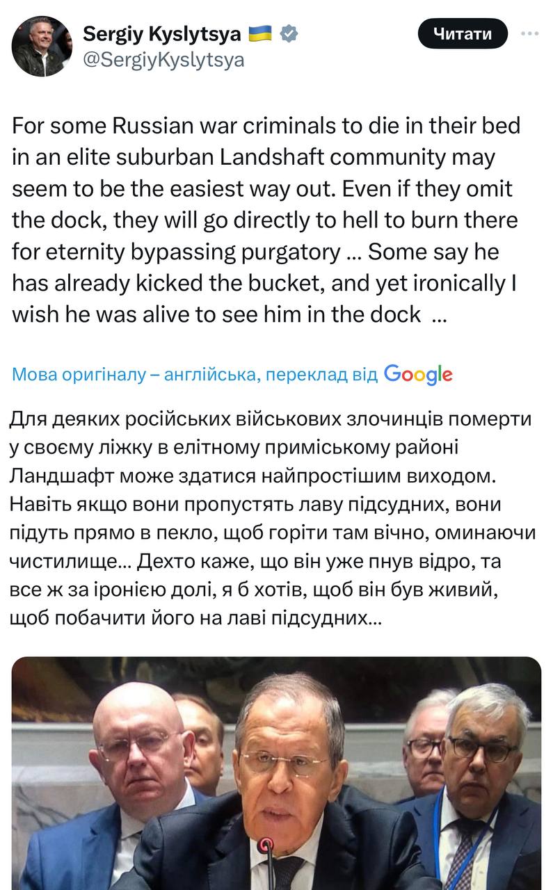 Постоянный представитель Украины при Совете безопасности ООН Сергей Кислица совершил загадочный намек в социальной сети X о возможной смерти министра иностранных дел России Сергея Лаврова.