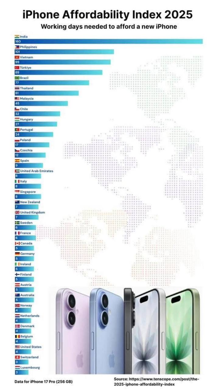 После презентации iPhone 17 Pro эксперты подсчитали, сколько дней среднему работнику нужно отработать, чтобы позволить себе новый флагман Apple. Если в Люксембурге это всего три дня, то украинцам придется работать около 55 дней, а жителям Индии — 160.