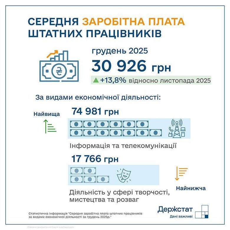 В декабре 2025 года средняя заработная плата штатных работников в Украине выросла на 13,8% по сравнению с ноябрем и составила 30 926 грн. Самые высокие доходы получают работники столицы и Луганской области, самые низкие – в Кировоградской, Черновицкой и Черниговской областях.