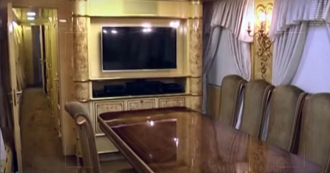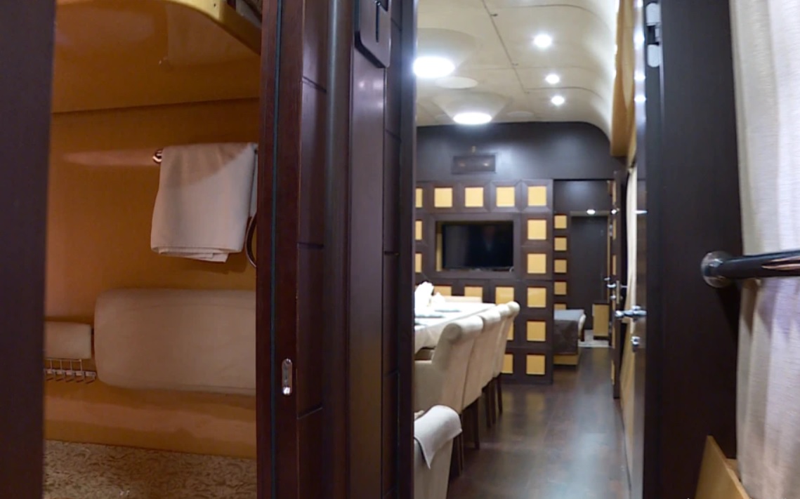 В частности, он включает в себя вагон-ресторан с большим видеомонитором, а рядом со столовой есть мягкое купе на четырех человек. Также там есть спальня для двух человек с двуспальной кроватью размера "king-size", рядом с которой расположена большая ванная комната с туалетом и душем.