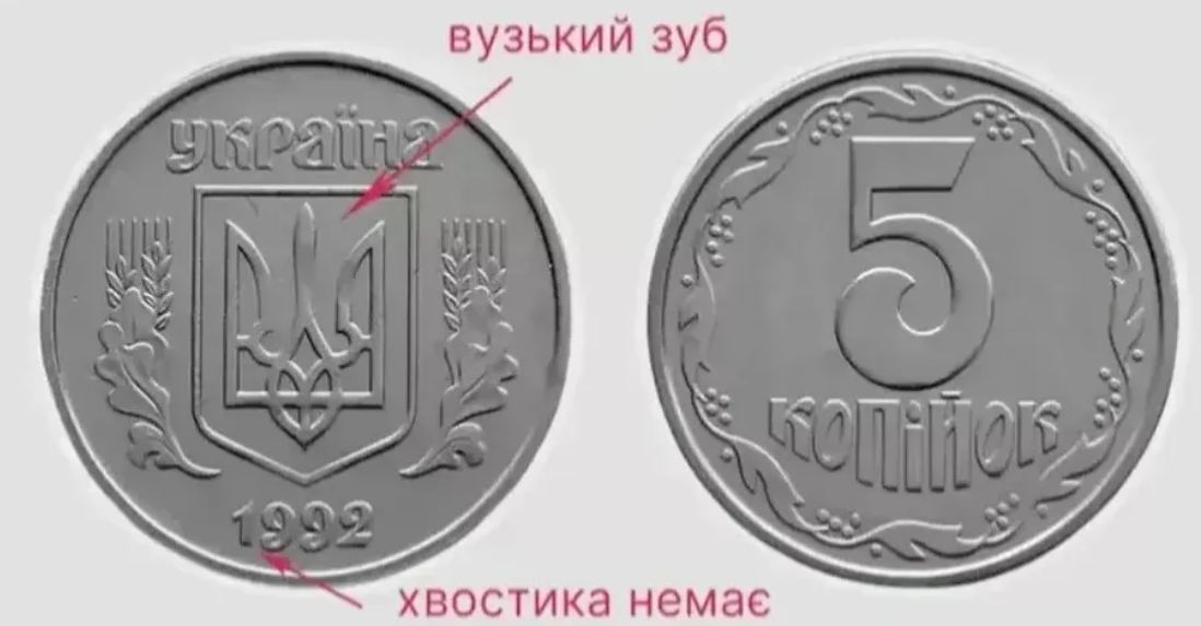 Другие ценные монеты включают 5 копеек 1992 типа 2БАм, за которые можно получить от 2500 до 3000 гривен. Их характерные признаки: