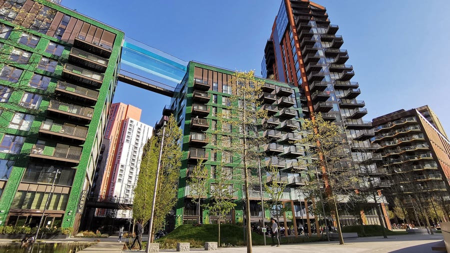 25-метровый прозрачный бассейн разместили между десятыми этажами двух жилых небоскребов в районе Nine Elms на юго-западе Лондона. Сооружение является работой архитекторов фирмы Arup Associates, которые проектировали Сиднейский оперный театр.