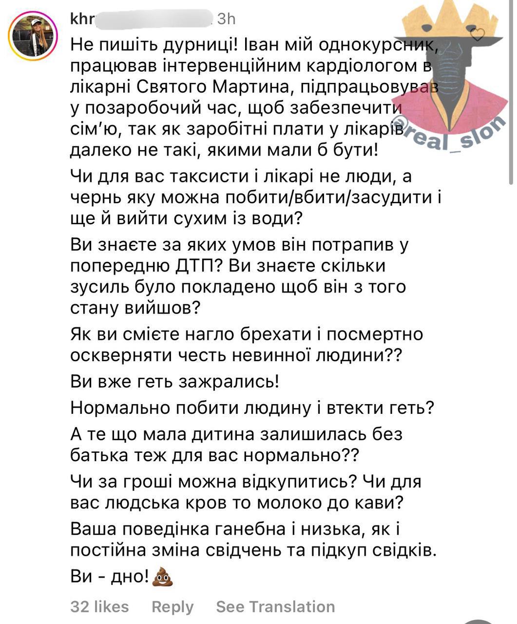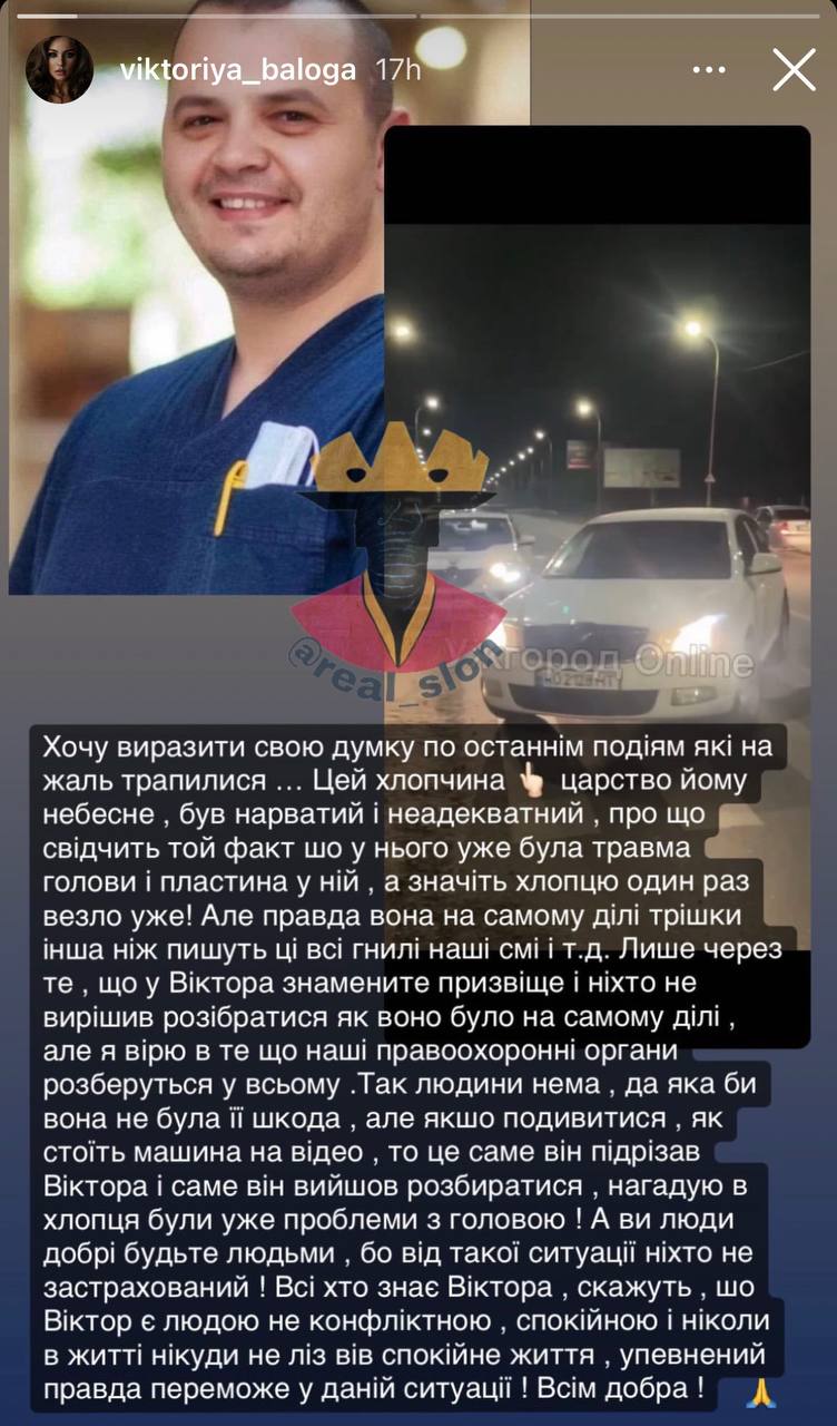 Отношение к потерпевшему со стороны семьи Балоги иллюстрируют сообщения, опубликованные в соцсетях. В частности, сестра Балоги Виктория назвала врача "нарватым и неадекватным", но его "жаль, каким бы он ни был".