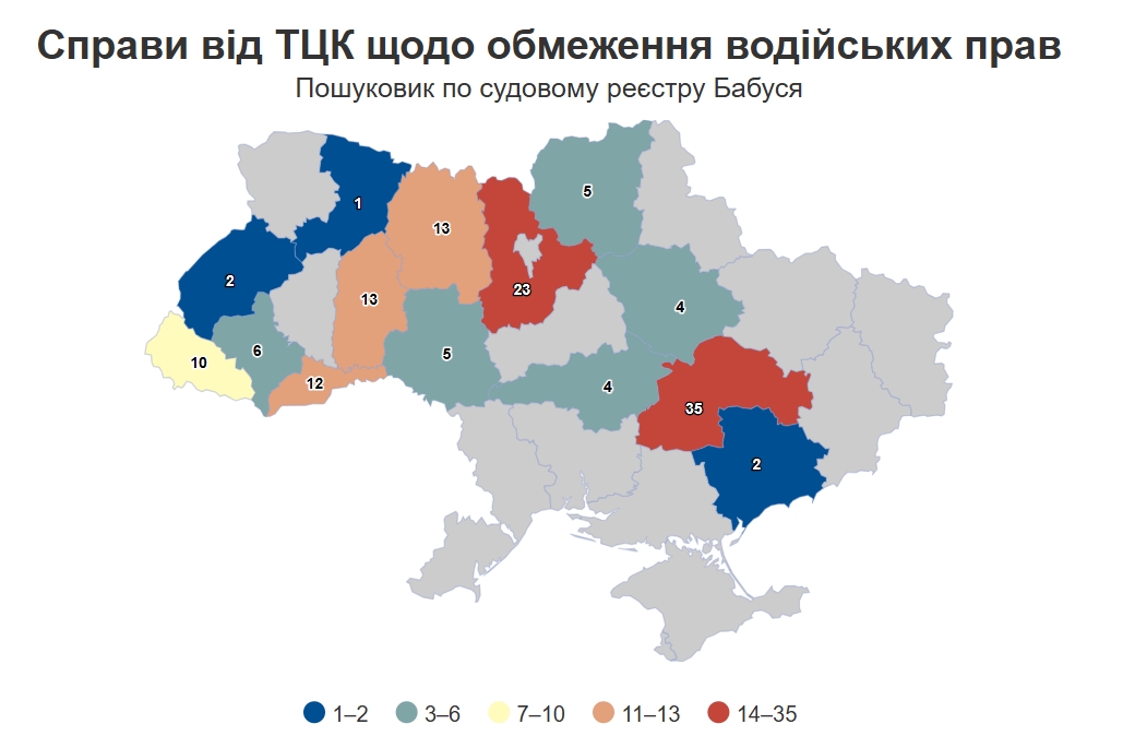 В настоящее время в Украине зафиксировано 135 судебных дел по искам ТЦК об ограничении права управления транспортными средствами. Из них 42 дела заведено уже в 2026 году, что превышает показатель за весь 2024 год.