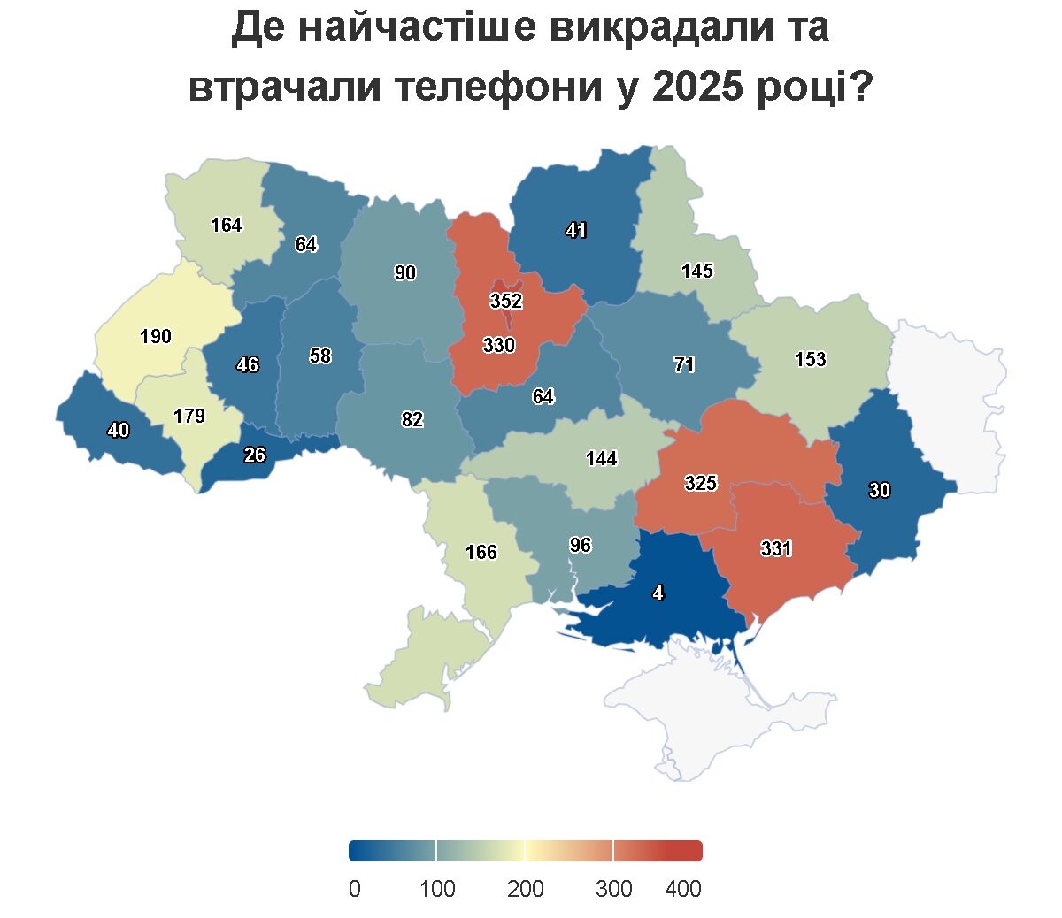 Самой спокойной с этой точки зрения является Херсонская область, где зафиксировано только 4 случая потери или кражи телефонов за указанный период.