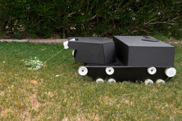 На башне есть видеокамера, светодиодные прожекторы, листодуйка, а также три отдельные сопла, которые "стреляют" потоками воды, гербицидов и пестицидов.