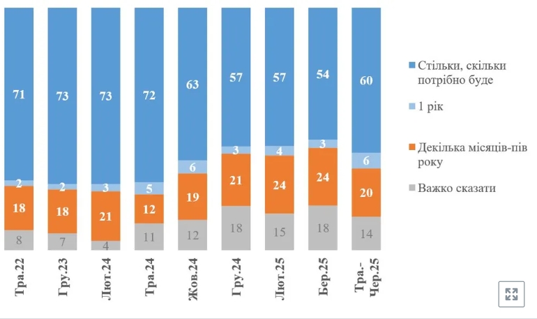 Количество украинцев, готовых терпеть войну столько, сколько потребуется, снова возросло после спада, который наблюдался в начале 2025 года. По результатам последнего опроса, проведенного Киевским международным институтом социологии (КМИС), 60% граждан заявили о готовности к длительному сопротивлению. Еще 6% респондентов отметили, что смогут выдержать войну в течение одного года.