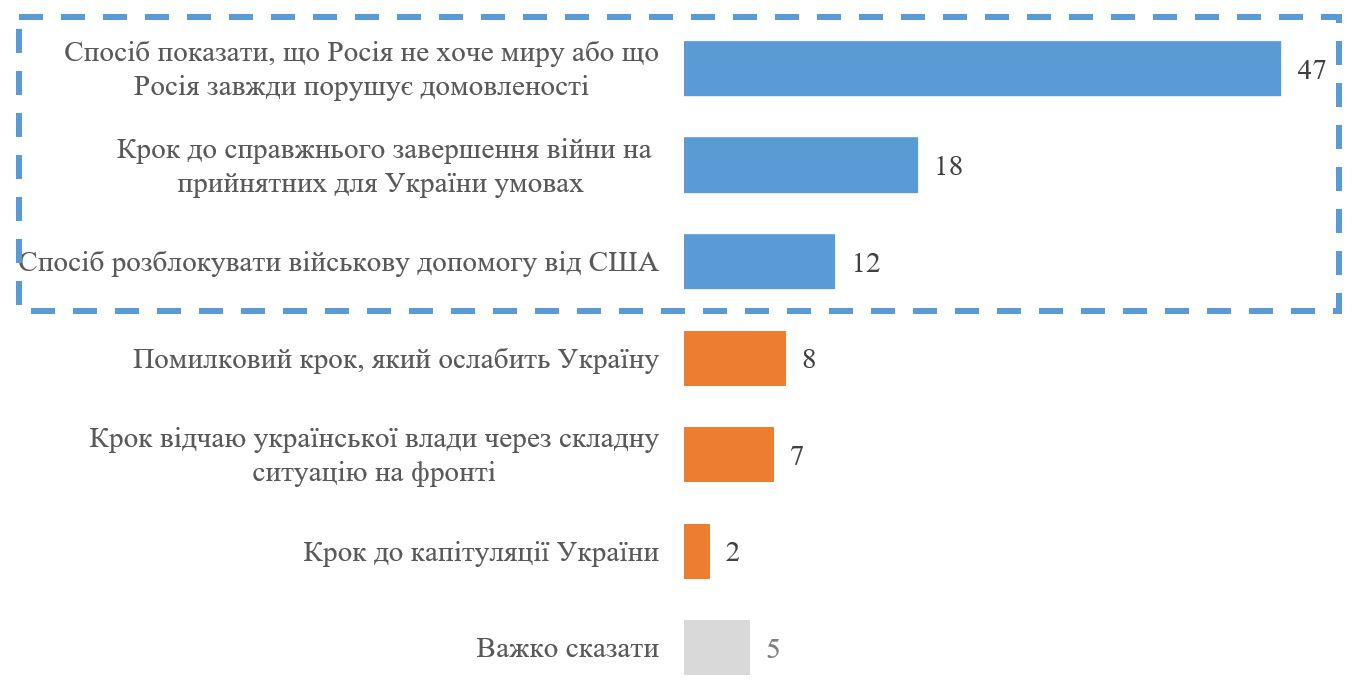 Опрос выявил, что почти половина респондентов (47%) считают 30-дневную остановку огня способом показать, что Россия не желает мира или нарушает предварительные договоренности. Еще 12% видят это как возможность разблокировать военную помощь для Украины, а 18% считают этот шаг важным этапом для завершения войны на приемлемых для Украины условиях.