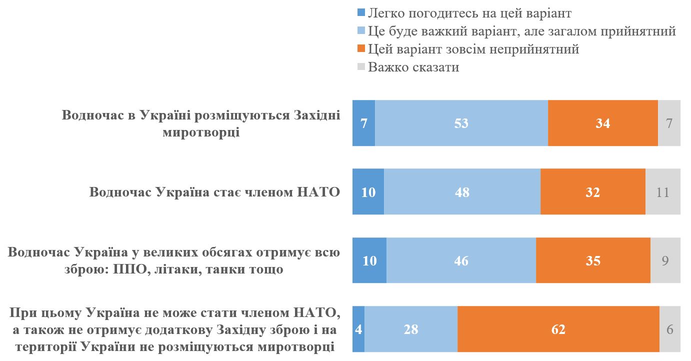 Если Украина получит определенные гарантии безопасности, более половины респондентов (хотя и с осторожностью) готовы поддержать прекращение огня. В то же время, поддержка вариантов с конкретными гарантиями безопасности варьируется. Наибольшую поддержку получил вариант размещения западных миротворцев, поддерживающих 60% опрошенных. Членство в НАТО как гарантия безопасности поддерживают 58%, а усиленная поддержка сил обороны Украины — 56%.