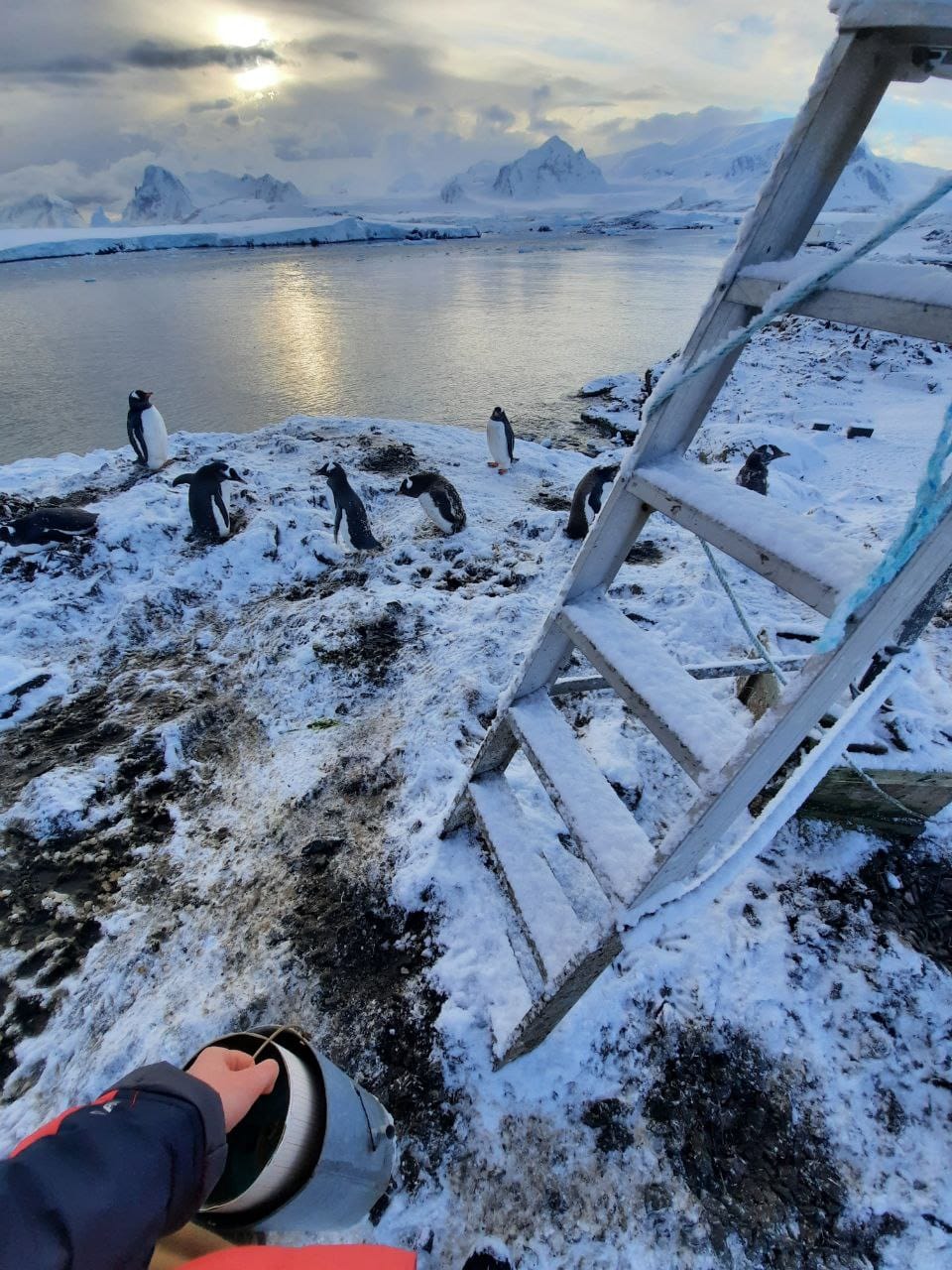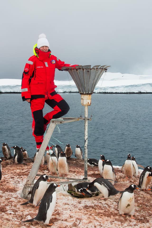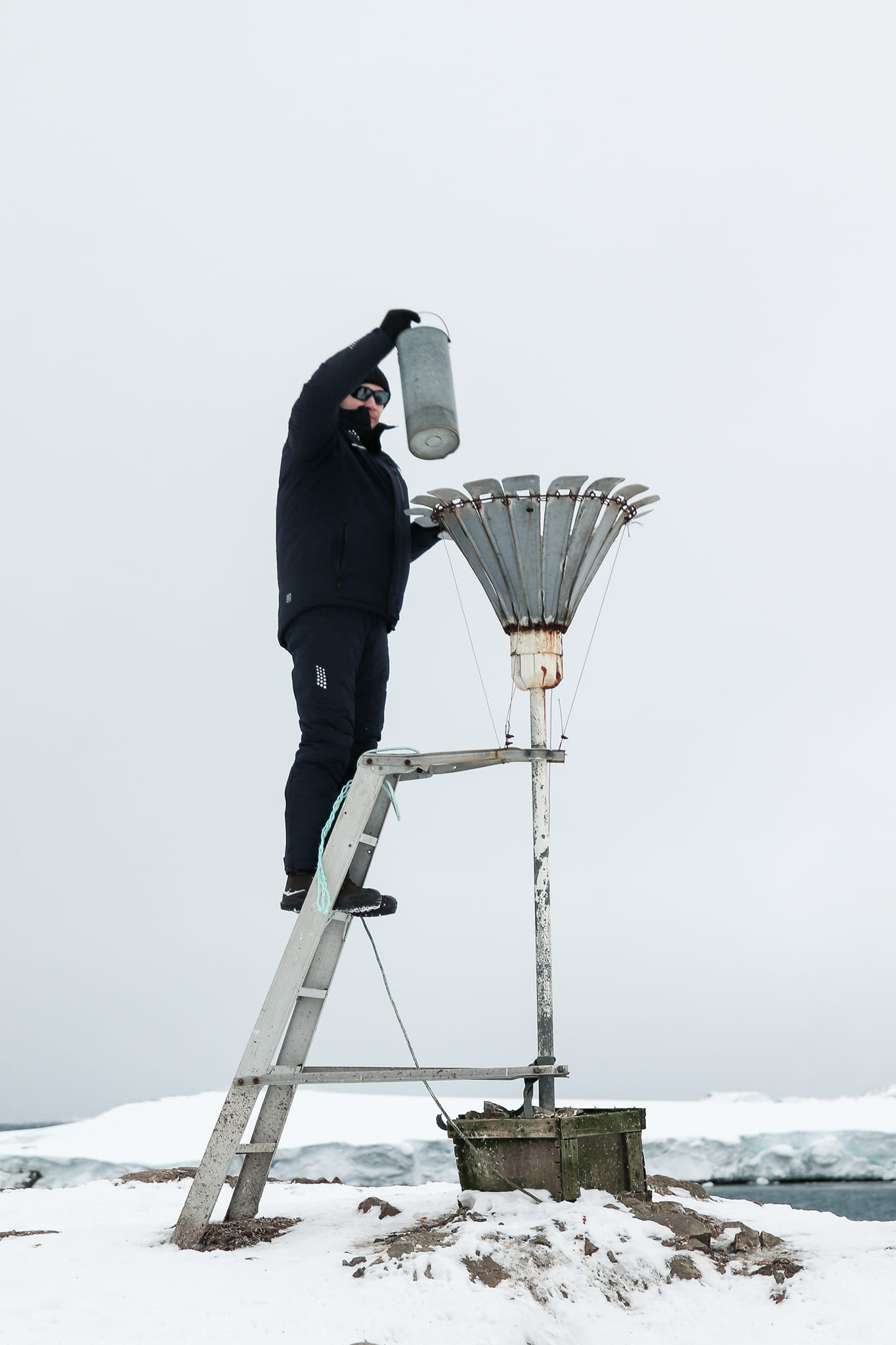 - Утром и вечером ученые принимают пробы осадков из специальной установки, на которую им приходится подниматься по стремянке.