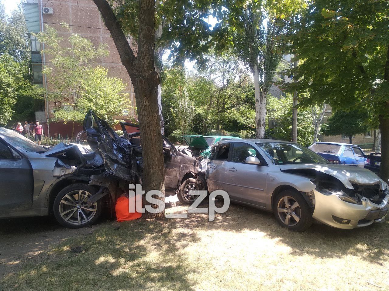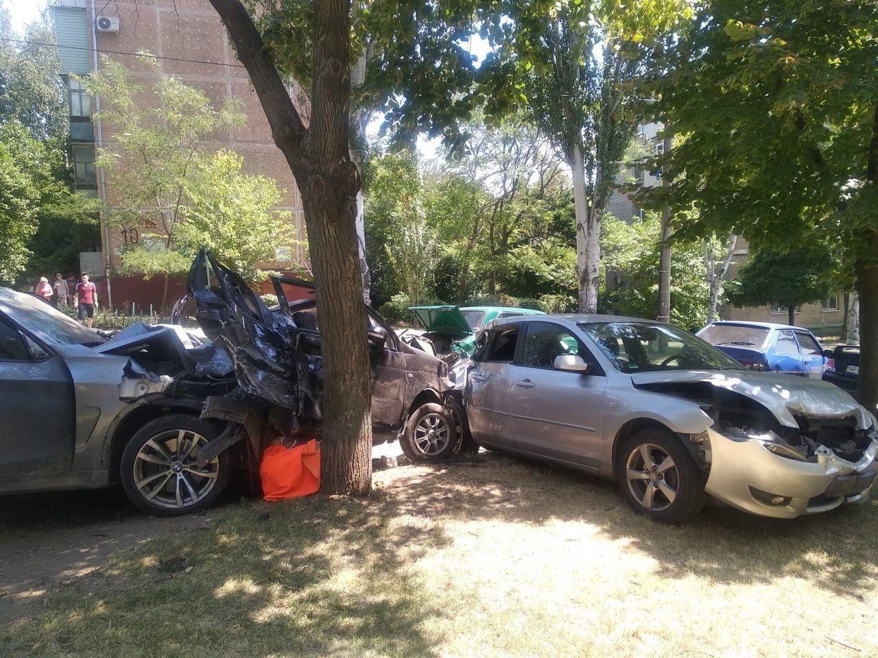 Как сообщают очевидцы в соцсетях, водитель BMW на скорости протаранил несколько припаркованных автомобилей и въехал в коммунальщиков, которые косили газон: