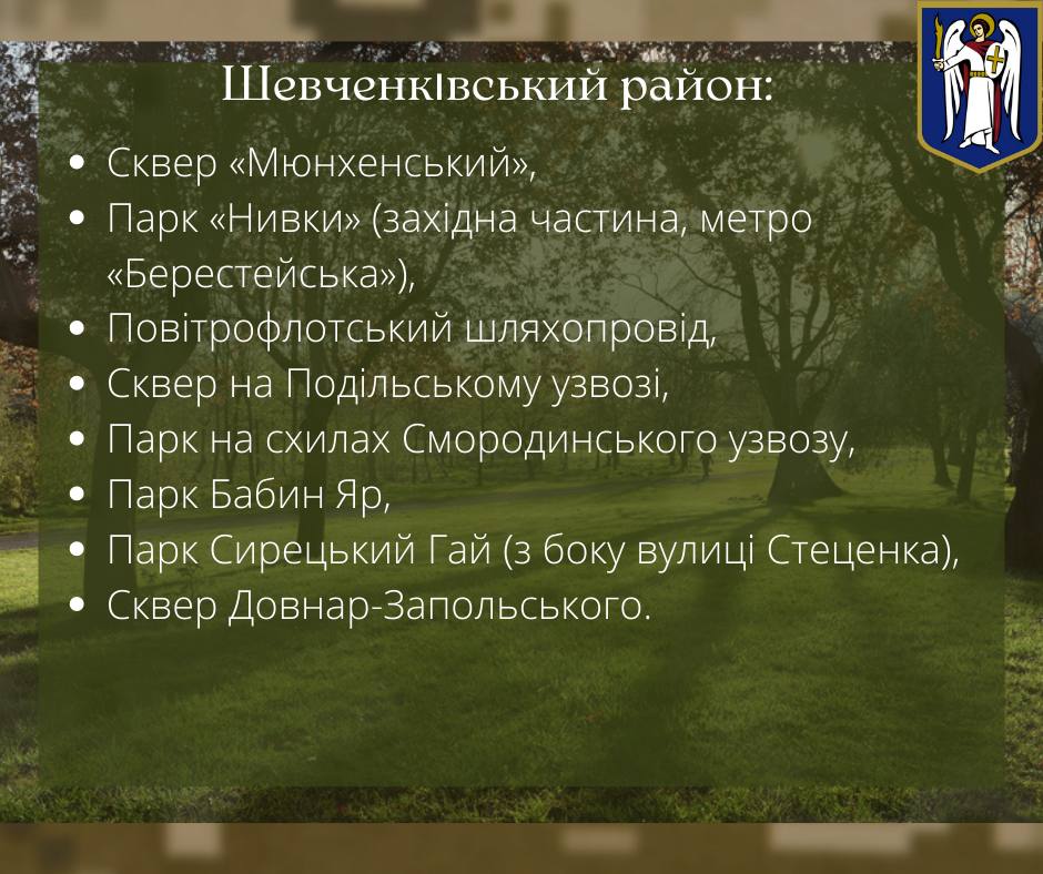 В окрестностях Киева велись боевые действия, поэтому в некоторых парках опасно гулять из-за оставленных там снарядов и мин. В частности, речь идет о Пуще-Водице, Виноградаре, Святошинском лесопарковом хозяйстве, автомобильных дорогах в направлении Житомира и Вышгорода.