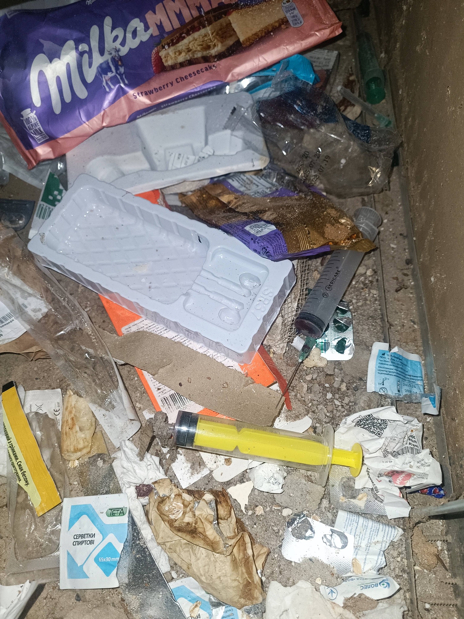Местные жители сообщают о критическом состоянии помещения. Внутри — сильная вонь; бытовой мусор; использованные шприцы; грязь и следы длительного пребывания посторонних.