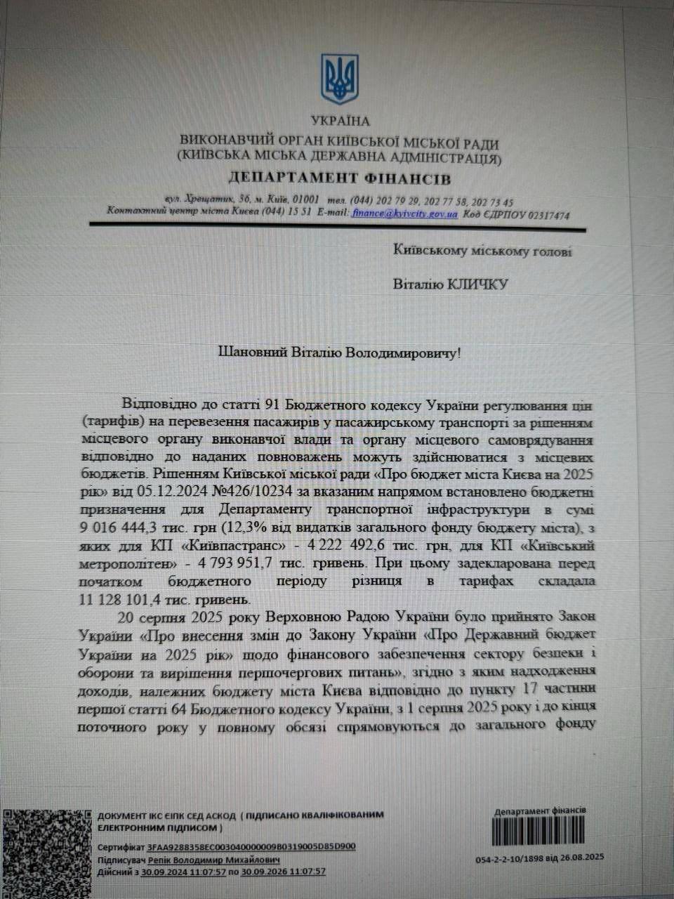 Об этом свидетельствует документ Департамента финансов КГГА, обнародованный народным депутатом Алексеем Гончаренко.