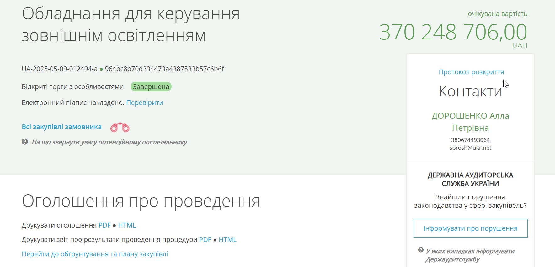 27 мая КП "Информатика" Киевского горсовета заключило договор с ГП "Хидден" ООО "Хидден Энерджи" на поставку оборудования для управления внешним освещением Киева на сумму 370,24 млн грн.