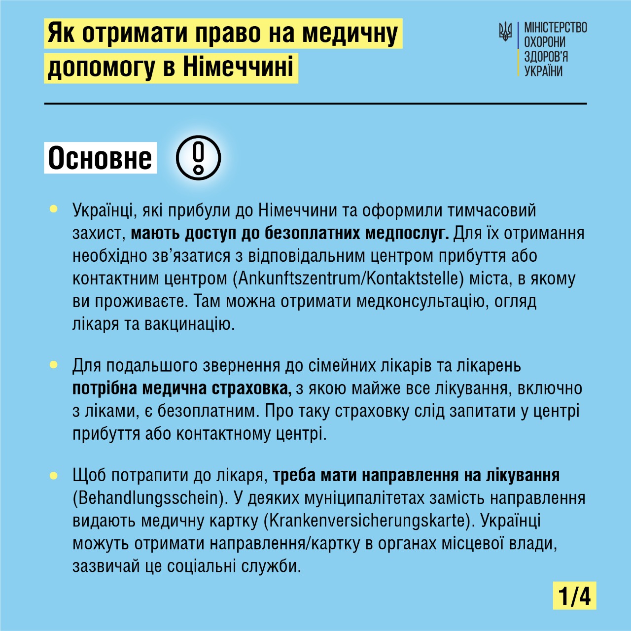 Основное: первоочередной точкой входа к получению медицинской помощи для украинцев, временно находящихся в Германии и оформивших временную защиту, есть ответственные центры прибытия или контактные центры (Ankunftszentrum/Kontaktstelle) городов проживания, - говорилось в сообщении.