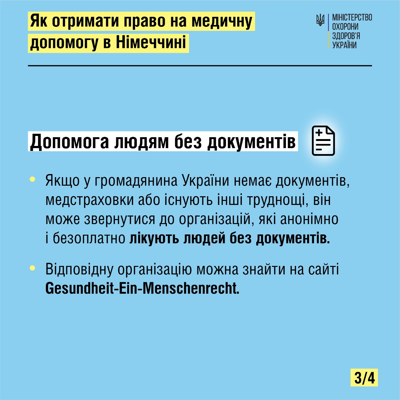 Украинцы также могут обратиться в организации, которые анонимно и безвозмездно лечат людей в случае отсутствия документов, медстраховки или других сложностей. Соответствующую организацию можно найти здесь.