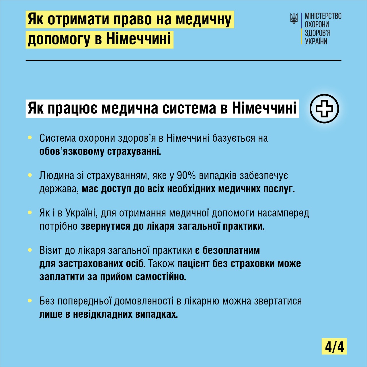 Таким образом, Германия обеспечивает страхование в 90%, поэтому гражданам будут доступны все необходимые медицинские услуги. Чтобы получить узкую медицинскую помощь украинцу, необходимо сначала обратиться к врачу общей практики. Визит к нему бесплатный для застрахованных людей.