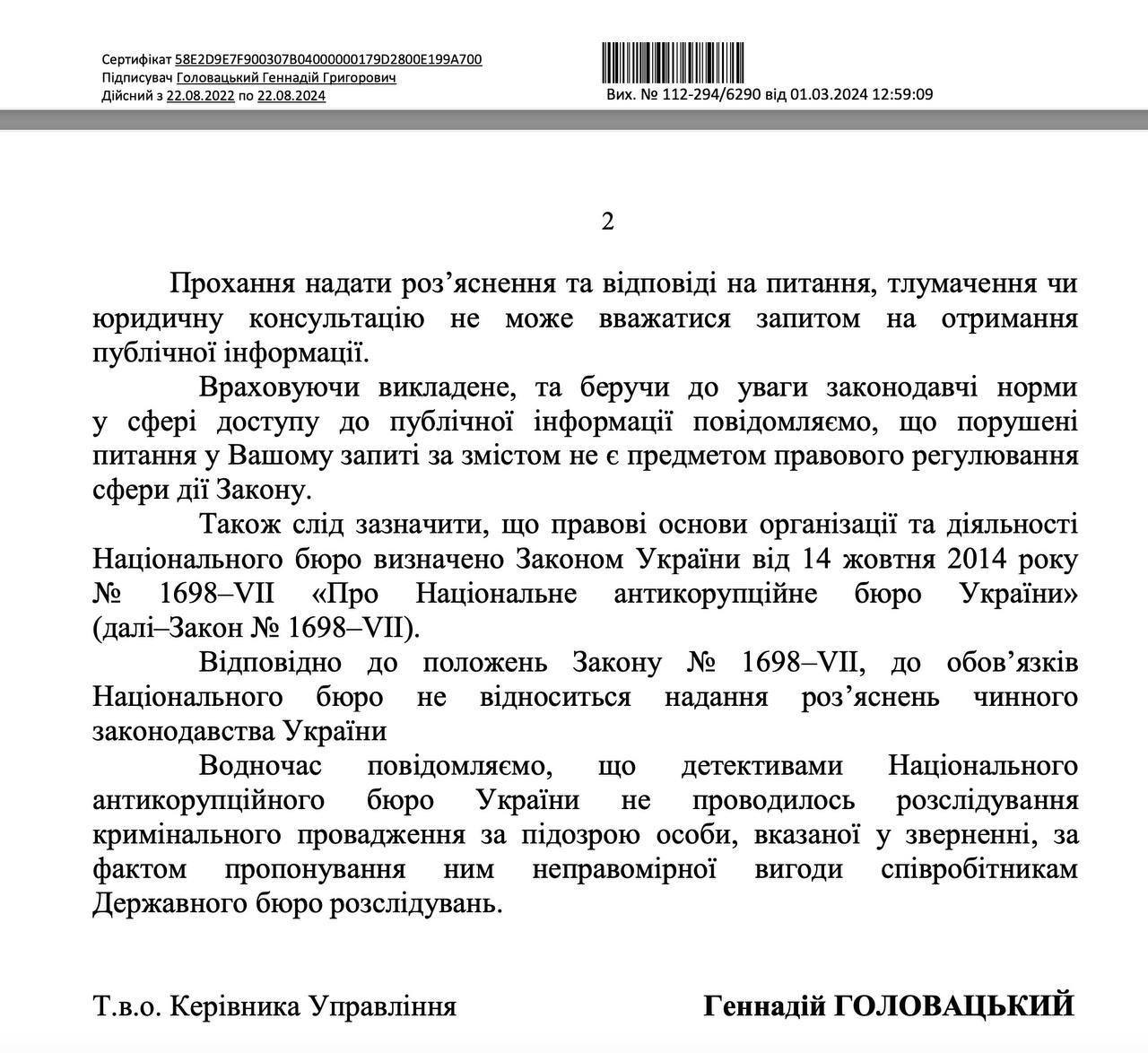 На запрос через портал доступа к публичной информации, в НАБУ на этот счет предоставили довольно специфический ответ. С одной стороны, на прямой вопрос "об осведомленности по делу" в Бюро этого тезиса не опровергли. Также не опровергли и тот факт, что Бюро может расследовать обстоятельства передачи средств представителям ГБР. Однако в НАБУ очень ясно отметили, что именно по подозрению Игоря Гриневича в неправомерных действиях следствия они не ведут.