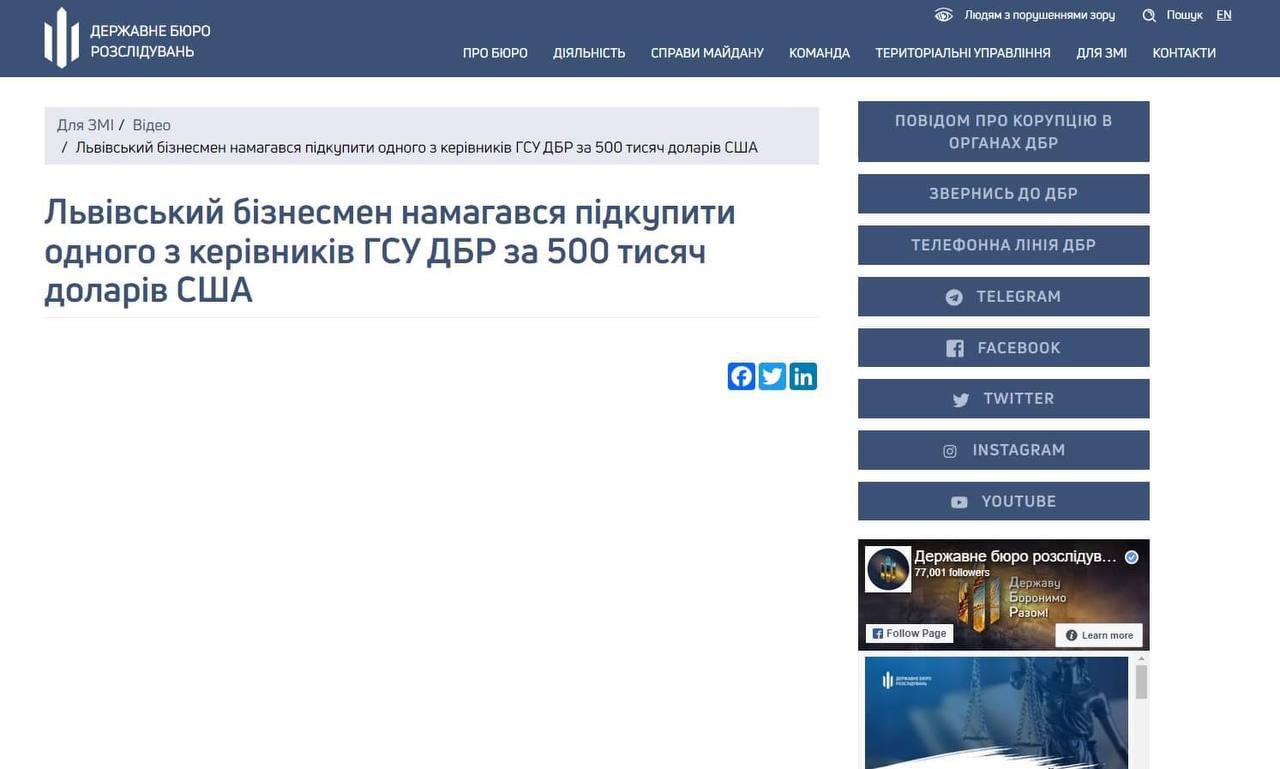 Третье, 29 декабря прошлого года, ГБР информировало о том, что львовский предприниматель Игорь Гринкевич пытался подкупить именно кого-то из заместителей руководителя управления "за $500 тыс.". Хотя текст этого сообщения на сайте Бюро уже отсутствует.
