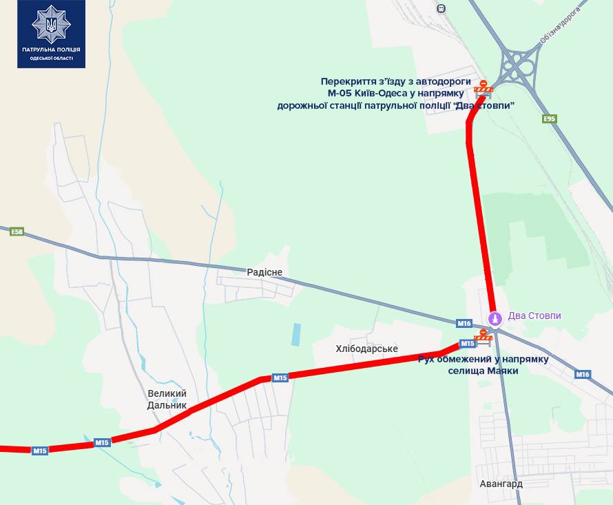 По его словам, движение перекрыто по дороге М-15 от дорожной станции патрульной полиции "Два Столба" в направлении Маяков. Транспорт теперь перенаправляют на дорогу М-16, ведущую в населенный пункт Кучурганы.