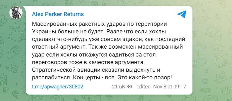 Российские пропагандисты утверждают, что Россия больше не планирует наносить массированные ракетные удары по Украине с помощью стратегической авиации, если Украина не сделает "что-то экстремальное", или откажется сесть за стол переговоров.