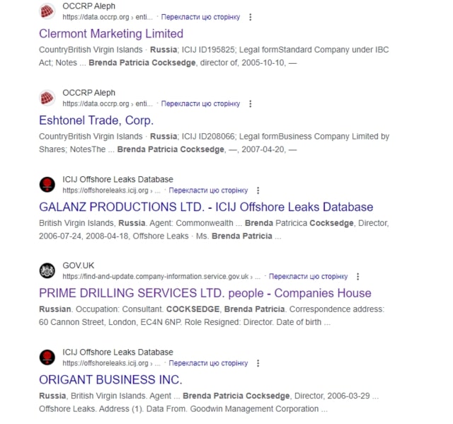 Если с Иванющенко у любителя гольфа Льва Гольдберга связь очень очевидна, то с россиянами немного более запутана. К примеру, упомянутая Бренда Патрисия Кокседж в свое время была в руководстве огромного количества фирм с российским капиталом. Чтобы это проверить, достаточно в Google написать поисковый запрос с этим именем в сочетании с Россией.