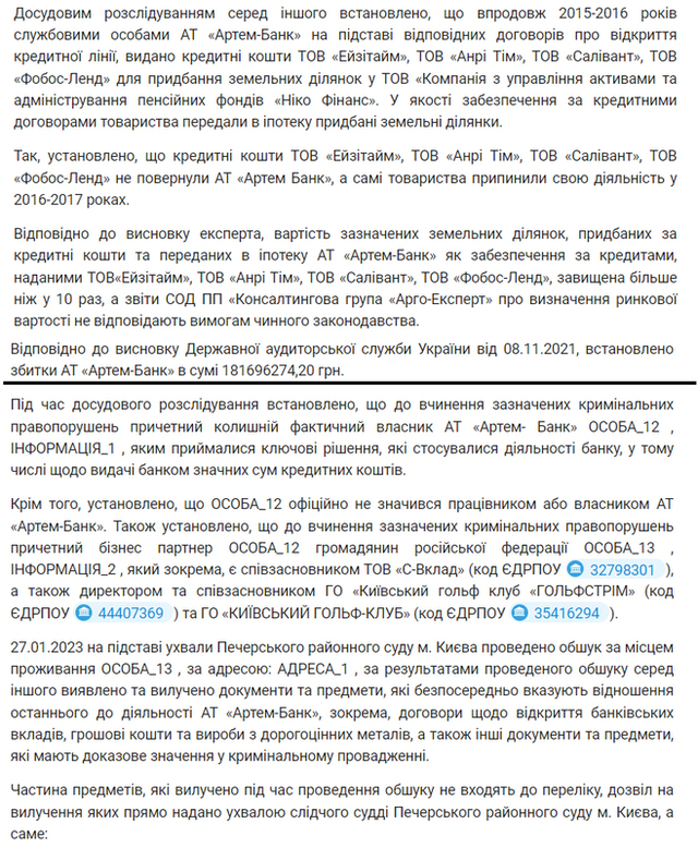В этом же решении упоминается следующее: «При досудебном расследовании установлено, что к совершению указанных уголовных правонарушений причастен бывший фактический владелец «Артем-банка», которым принимались ключевые решения, касающиеся деятельности банка, в том числе по выдаче банком значительных сумм кредитных средств. … Установлено, что к совершению указанных уголовных правонарушений причастен его бизнес-партнер – гражданин Российской Федерации, который, в частности, является соучредителем ООО «С-Вклад», а также директором и соучредителем ОО «Киевский гольф клуб «Гольфстрим» и ОО «Киевский гольф -клуб».