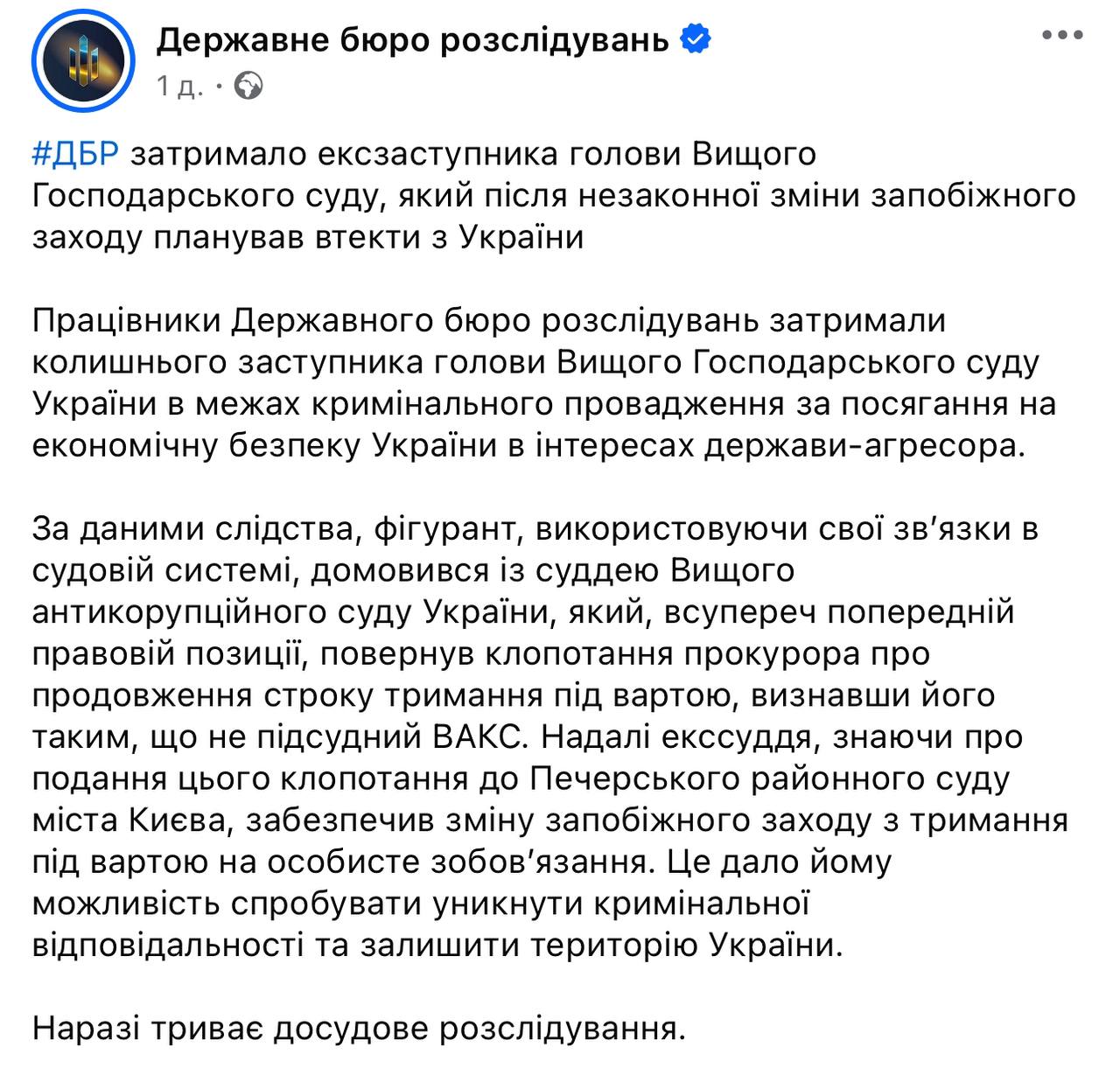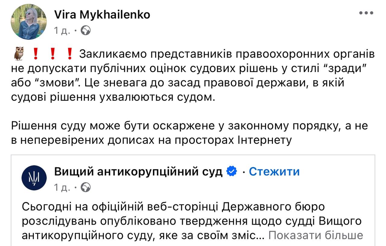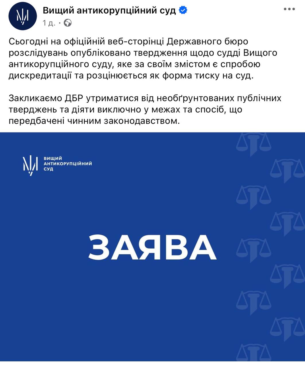 В ответ в тот же день вечером Высший антикоррупционный суд обнародовал официальное заявление, в котором назвал подобные утверждения со стороны ГБР недопустимыми.