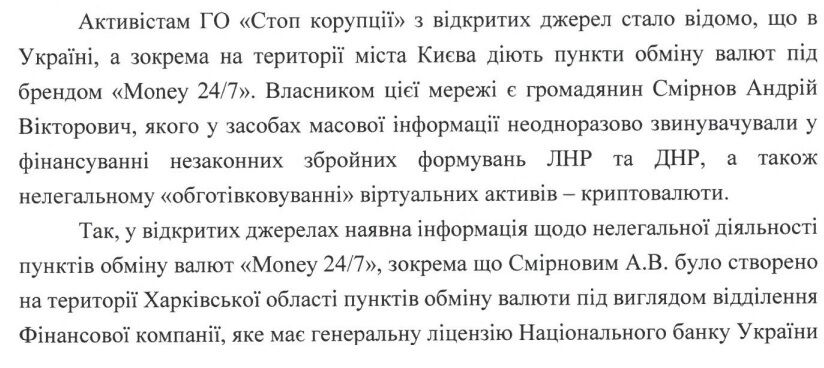 Общественная организация "Стоп Коррупции" обратилась в Офис Генерального прокурора с просьбой проверить информацию о деятельности пунктов обмена валют под брендом "Money 24/7", работающих в Киеве, и ее владельца, Андрея Викторовича Смирнова.
