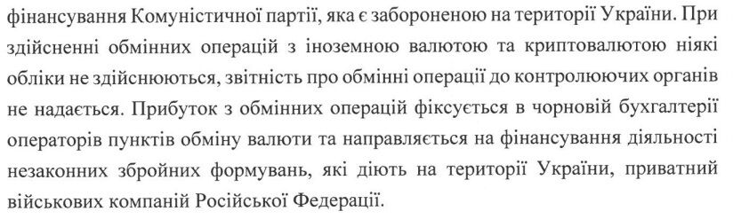 Среди основных обвинений, выдвигаемых против владельца сети, есть финансирование незаконных вооруженных формирований "ЛНР" и "ДНР", незаконное инкассирование виртуальных активов (криптовалюты) и участие в схемах по легализации денежных средств, полученных преступным путем. По информации ГО, известно о создании подконтрольной разветвленной сети обменно-валютных пунктов на территории Украины и сотрудничестве с аналогичными учреждениями в мире, включая использование интернет-сайта и бренда "Банковский дом".